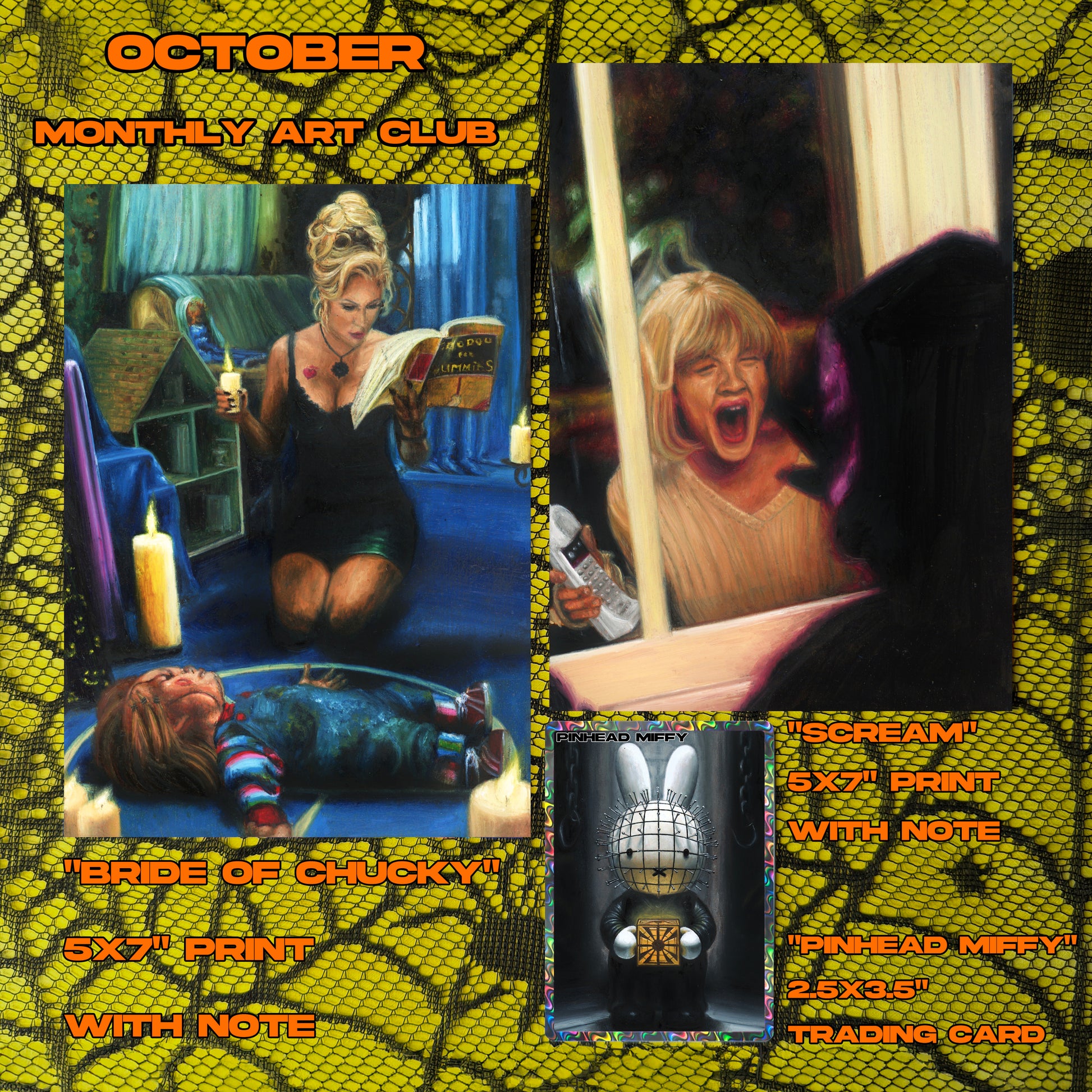 A monthly subscription for art lovers and collectors. Each month, members receive three exclusive items inspired by my latest paintings, from limited-edition postcard prints with handwritten artist’s letters to playful trading cards with rare holo variants. This month’s package includes:
